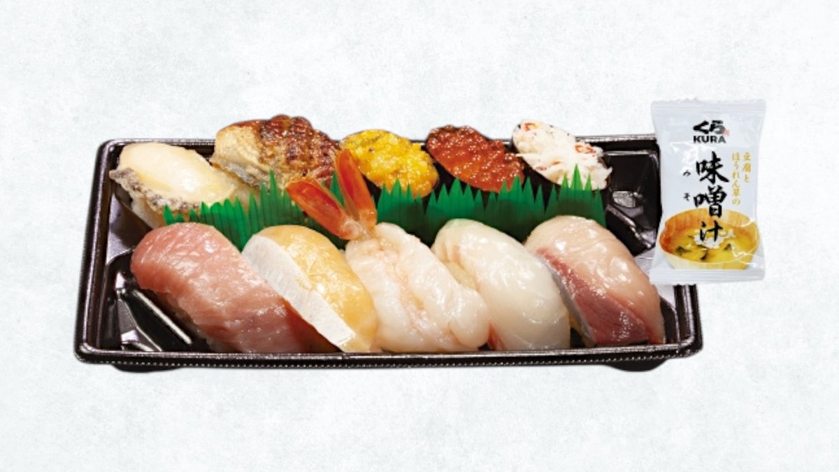 中とろ1貫・はまち1貫・熟成真鯛1貫・厳選サーモン1貫・赤えび1貫・あわび1貫・うなぎ1貫・うに入り海鮮軍艦1貫・いくら1貫・かに身1貫 ※フリーズドライの味噌汁が1つ付いてきます。 ※わさび抜きでご提供しています。 別付のわさびでお召し上がりください。 ※醤油・ガリ・わさび・はしなどは規定量お付けしております。 追加でお付けすることはできません。 ※中とろ、厳選上まぐろ、あわび、厳選上サーモン、うなぎは時期によって内容が異なります。 ※セットメニューの内容は変更できません。 ※生ものですのでお受け取り後、1時間以内にお召し上がりください。