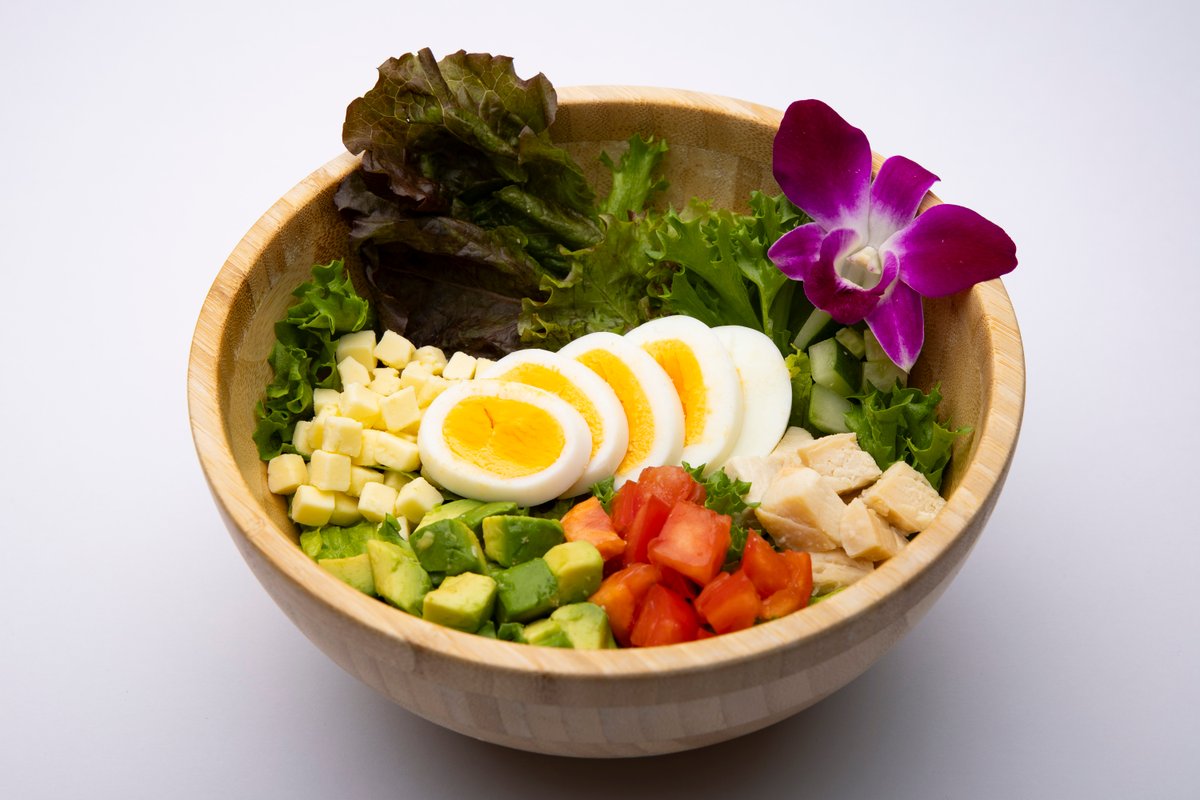2〜3人前。彩り豊かな野菜にチキンや卵をトッピングした、ボリューム満点の定番サラダです。