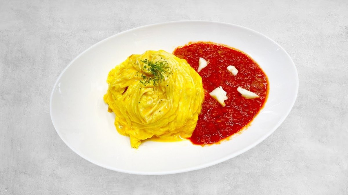 完熟トマトの酸味と甘みを活かしたさっぱりトマトソースをふわふわ卵に合わせたオムライス。卵の甘みとトマトソースのほのかな酸味が相性バツグンです!