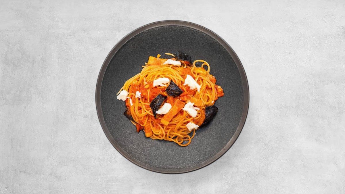 ナス、ベーコン、モッツァレラチーズをたっぷり使ったトマトパスタです。素材の旨みがトマトソースとよく合い、みんなに愛される定番の一皿です。