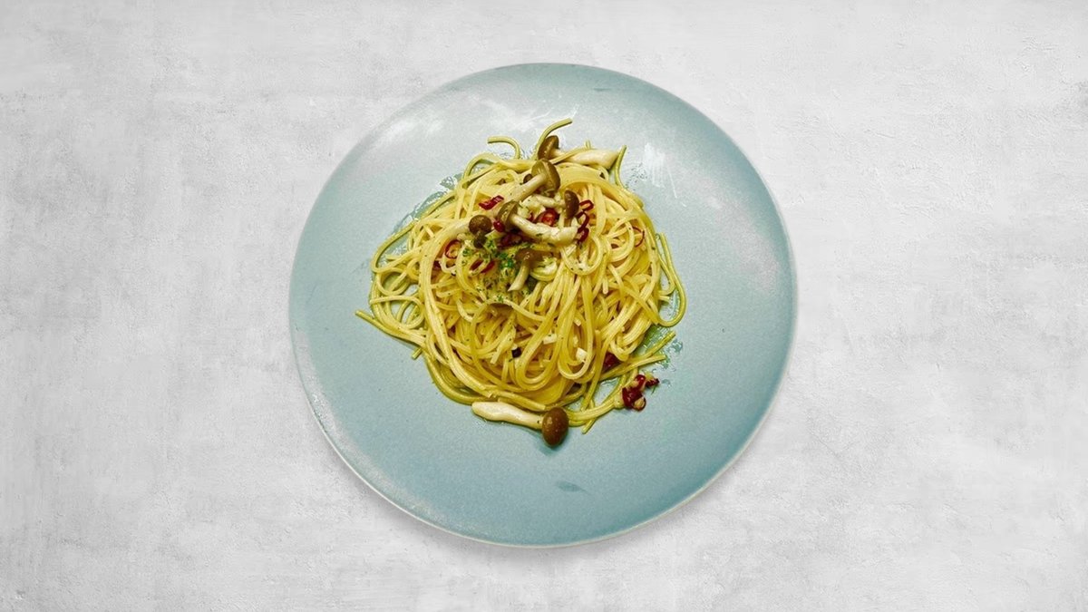 唐辛子とニンニクのパンチが効いた、キノコたっぷりのペペロンチーノです。香り豊かで食欲をそそる一皿に仕上げています。
