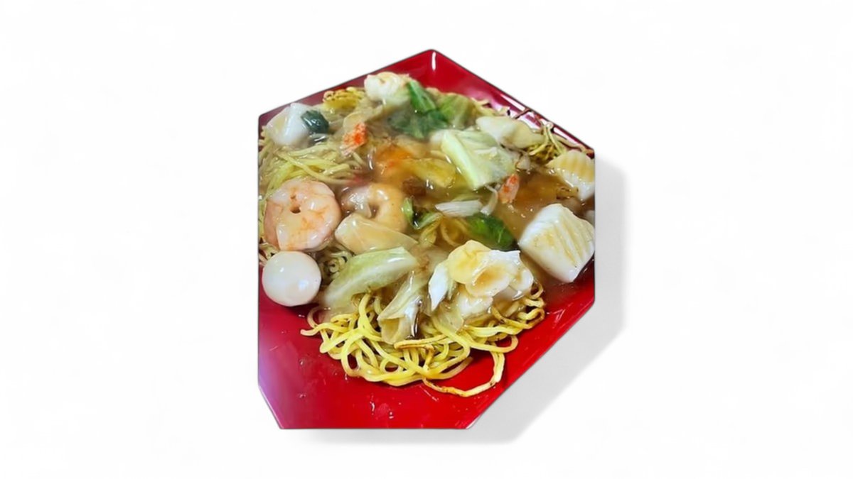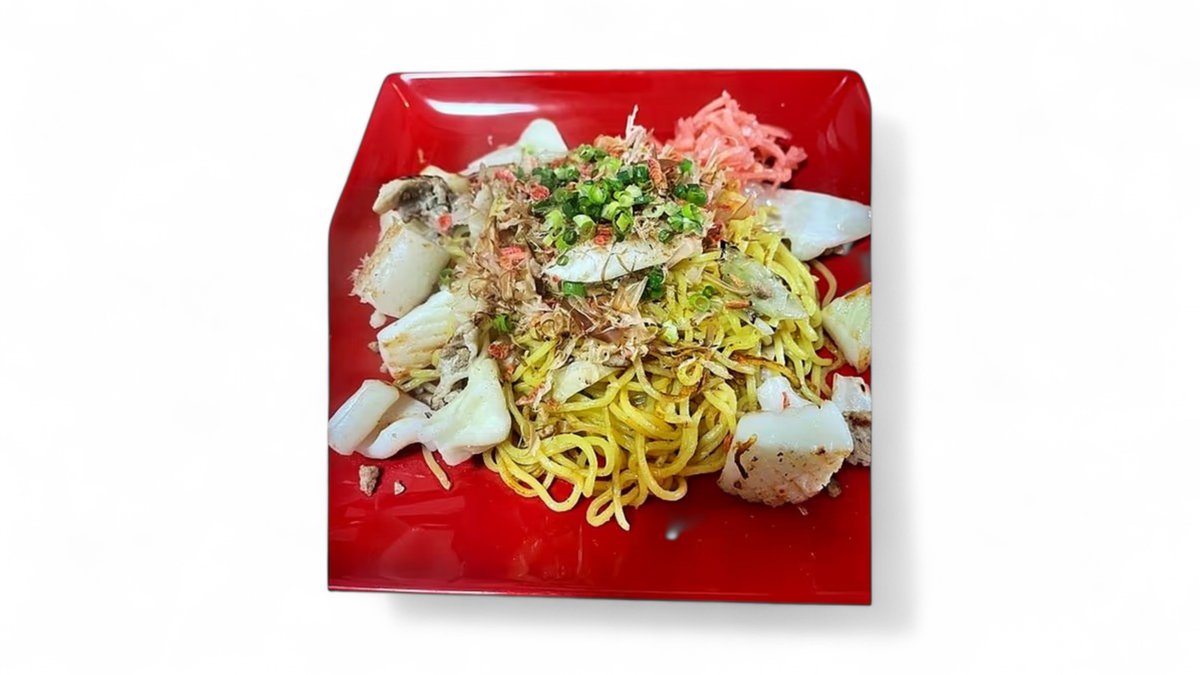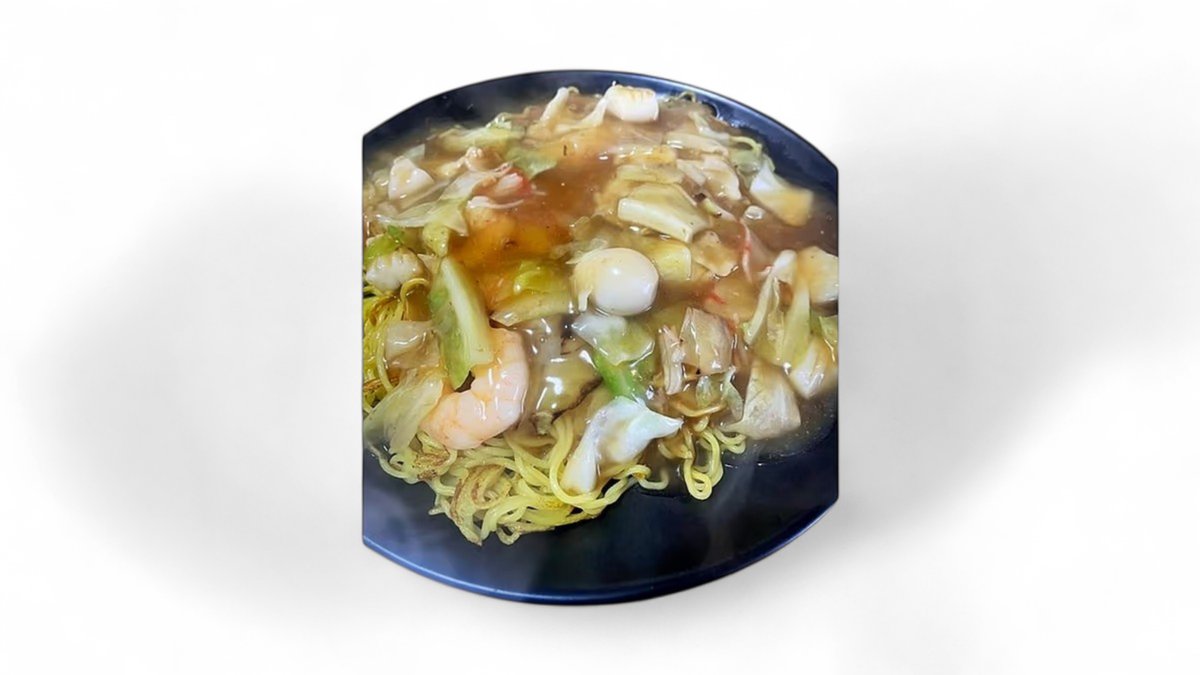 もちもち自家製麺を強い火力で炒め、醤油餡にエビ・イカ・うずらのたまご、野菜 が絡んだ一品です。