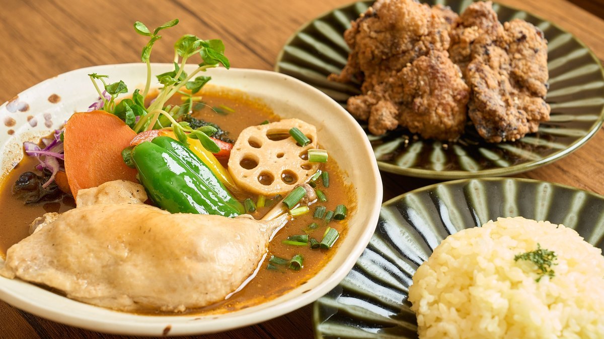 コクまろやかで心地よい辛さのスープと、ほろほろのチキンやジューシーなハンバーグが魅力のスープカレーです🍛ヘルシーな野菜のスープカレーもあって、カロリーが気になる方にもお楽しみいただけます。