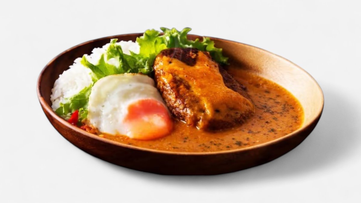 ロコモコスタイルのハンバーグとライスを使った、ボリュームたっぷりの洋風カレーです。