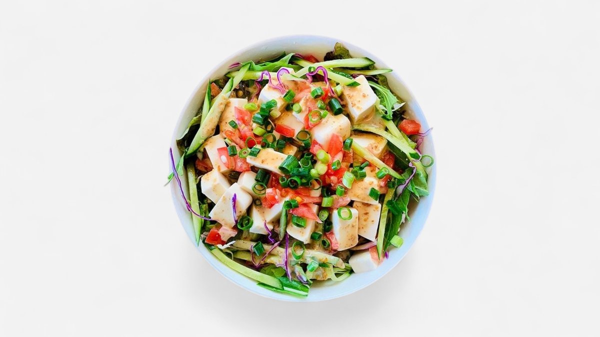 なめらかな豆腐と新鮮な野菜を組み合わせた、ヘルシーでボリュームのあるサラダです。