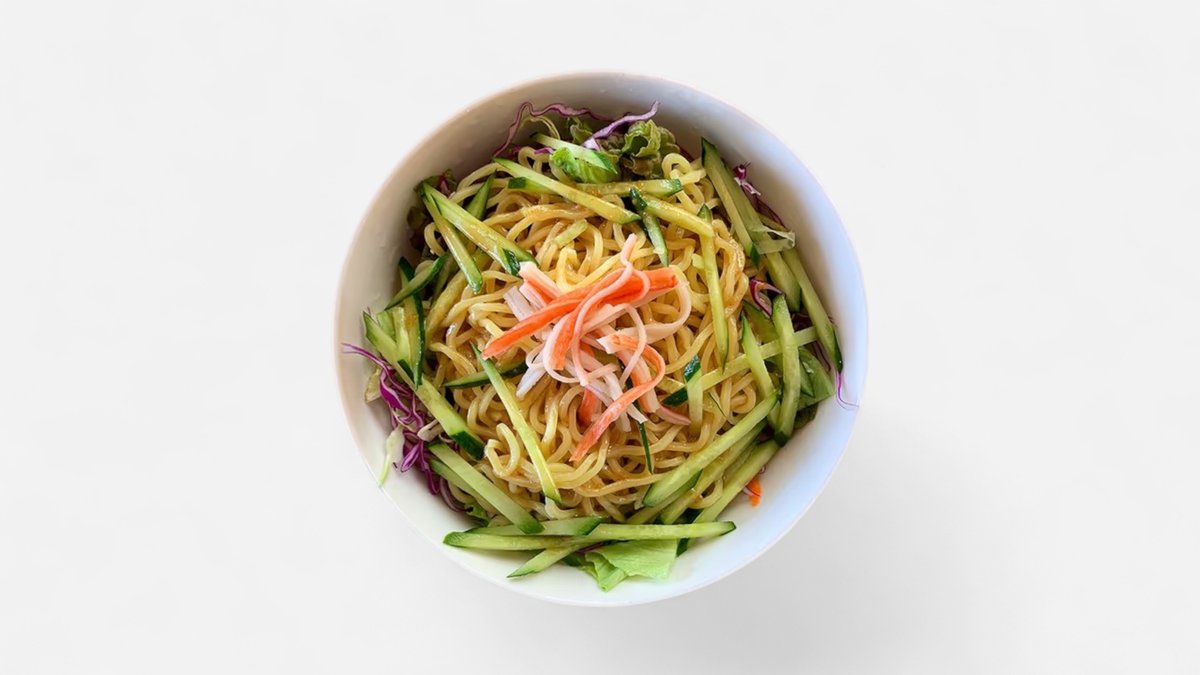 つるっとした麺とシャキシャキ野菜を特製ドレッシングでさっぱりと仕上げた、食べ応えのある冷製サラダです。