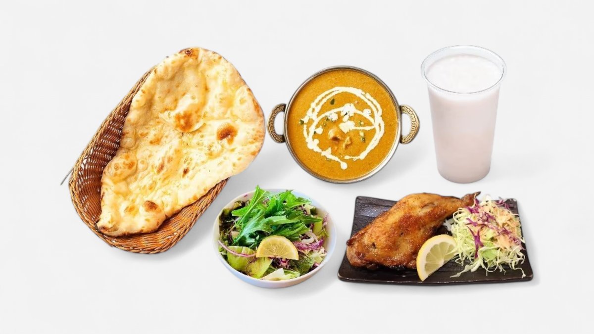 チキンカレーにナンやライス、スパイス香るタンドリーチキン、サラダ、マンゴーラッシーまで楽しめるボリュームセット。