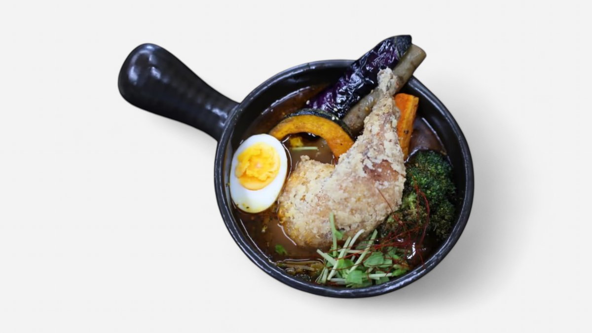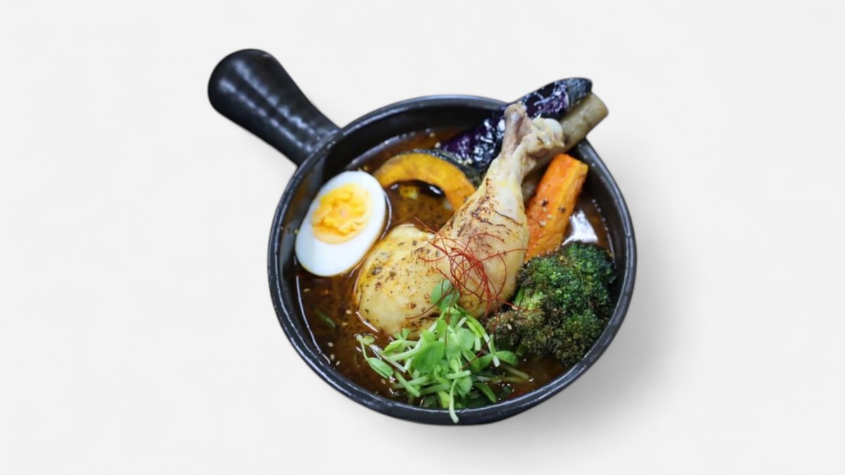 骨付きチキンの旨みとたっぷり野菜の出汁が溶け込んだ定番のスープカレー。スパイスの香りが食欲をそそります。