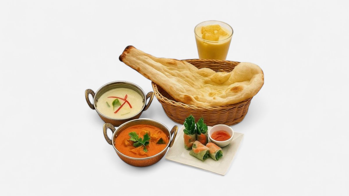 チーズがとろけるナンと、お好きなカレー、マライティッカ、ドリンクがセットになった贅沢な一皿です。