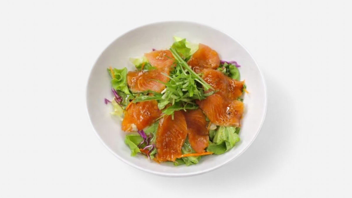 しっとりとしたサーモンフィレ、サクサクのミックスグリーン、爽やかなビネグレットドレッシングが特徴の新鮮で健康的な一皿。