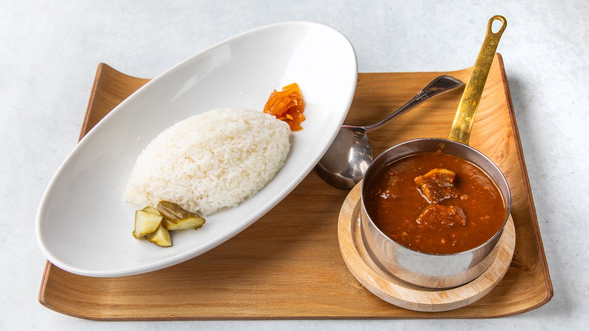 こだわりの長谷川自然牧場産の熟成豚肉をやわらかく煮込み、旨い煮汁に”友情のりんご”のすりおろしを加えた特製ソースのカレーです。