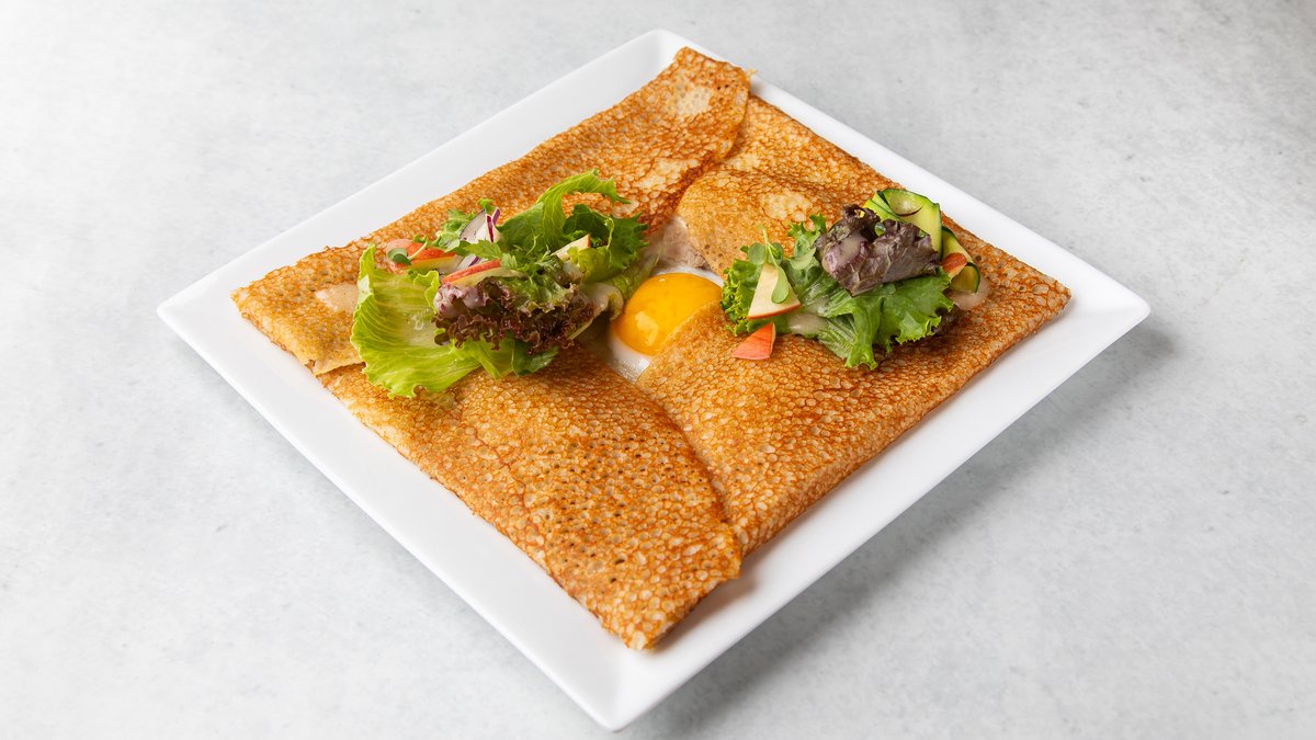 りんご、ハム、卵、チーズをのせたガレットです。白神産のそば粉を使用しています。