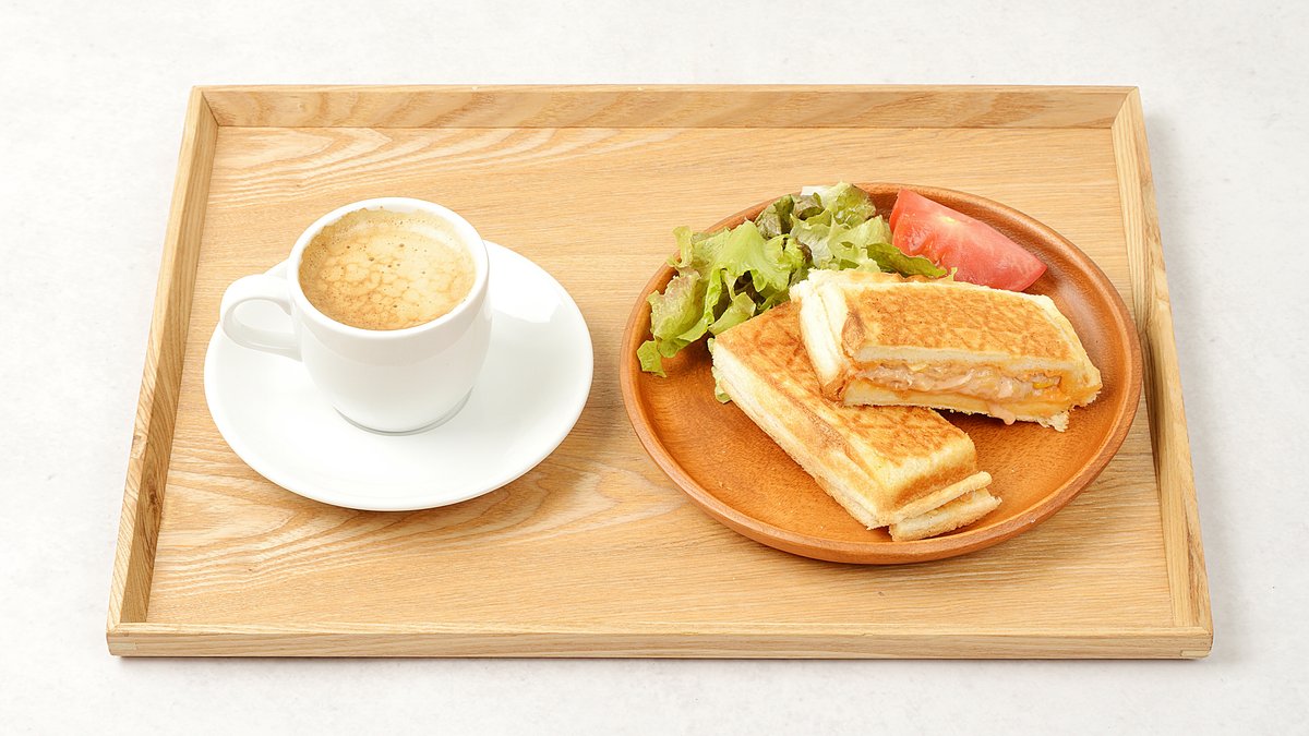 サクサクのパンに具材がたっぷり挟まれたホットサンドのセット。※ソフトドリンク付き。