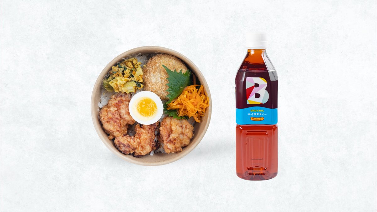 自家製発酵調味料「ひしお」で味付けした大きなコロッケと、塩糀からあげが3つものったボリューミーなお弁当とドリンク「あずき美人茶」または「ルイボスティー」から選択できるセットです。 ※ごはんは白米です。
