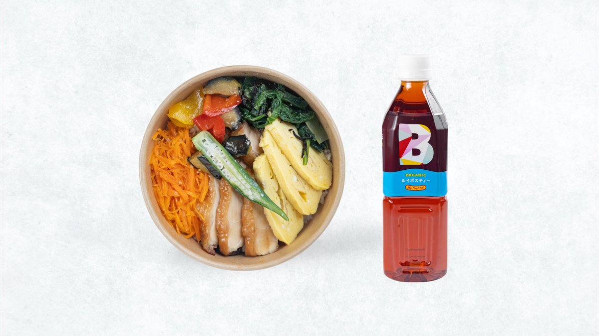 白米のご飯の上にとりの照り焼きや卵焼きなど5種類のおかずをのっけたお弁当とドリンク「あずき美人茶」または「ルイボスティー」から選択できるセットです。