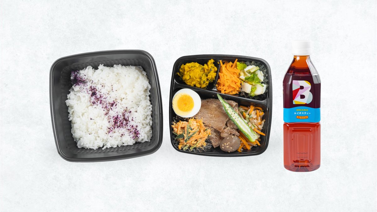 ボリューム感のあるおかずとご飯の二段弁当とドリンク「あずき美人茶」または「ルイボスティー」から選択できるセットです。