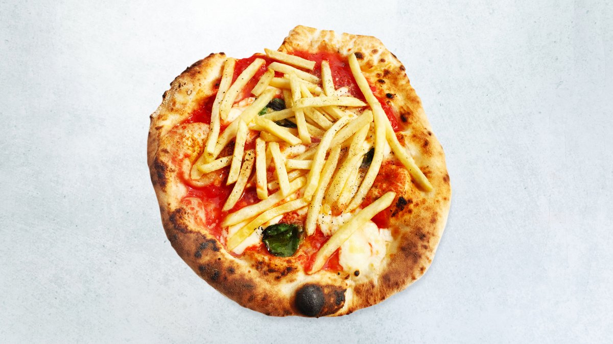 トマトソース、モッツァレラ、バジル、フライドポテトのピザ