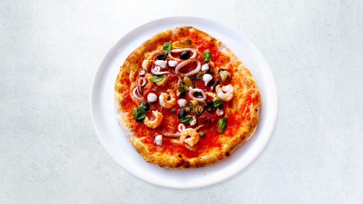 エビ、イカ、タコ、シラス、にんにく、トマトソースのピザ