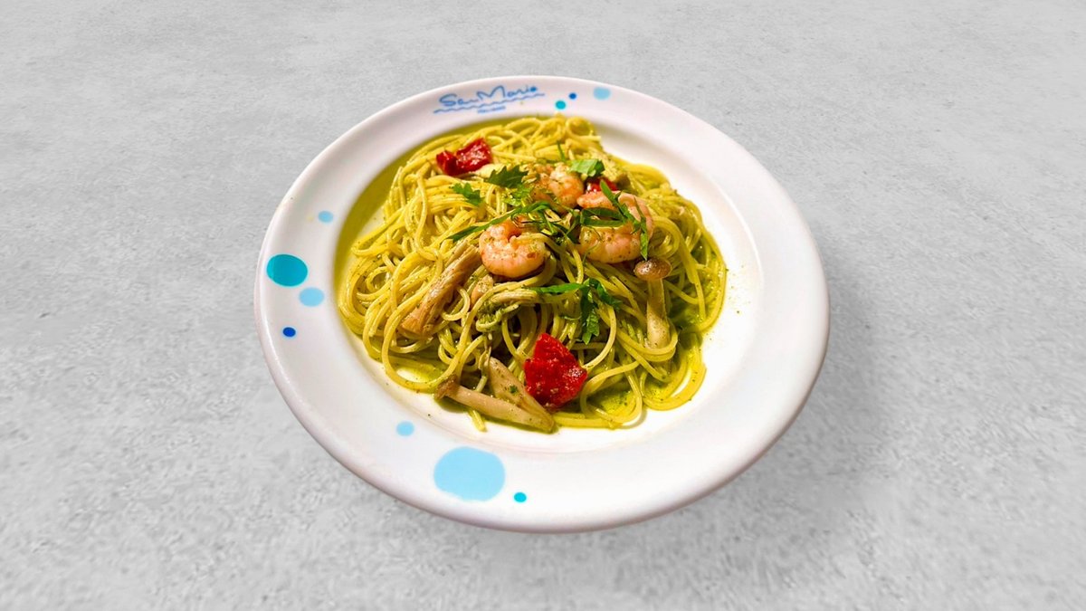 エビ・キノコ・ドライトマトの大葉ジェノベーゼ スパゲッティ