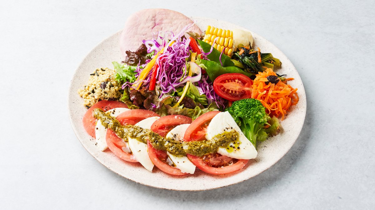 新鮮なトマトとモッツァレラチーズが絶妙なカプレーゼと、健康を意識した野菜のプレートです。
