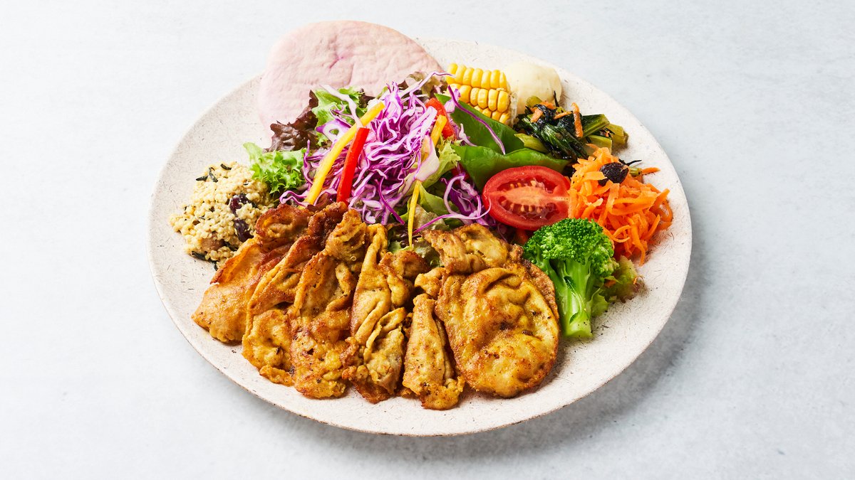 香ばしいカレーソースが絡んだポークと、栄養たっぷりの野菜が彩るプレートです。