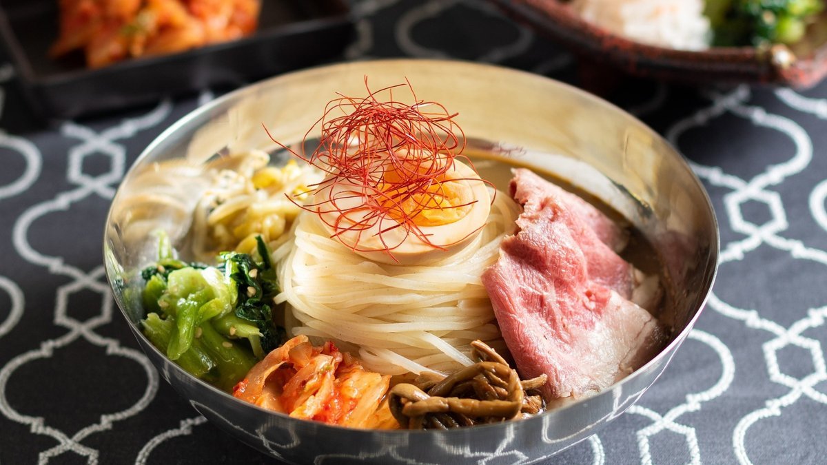 シンプルな基本の冷麺。 酢の酸味につるつるの麺、複雑に絡み合う旨みが一体となり、食欲がないときでも身体にすんなりとはいってきて、元気がみなぎってきます!