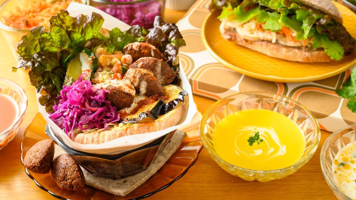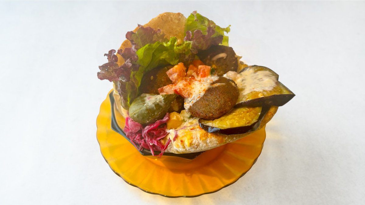 ひよこ豆のコロッケとたっぷり野菜を厚手のピタパンに挟んだ、10種の具材を3種のソースで味わう中東発祥のベジタリアン料理。 ボリュームもありながらさっぱりとヘルシーなサンドイッチです。 (一部に小麦、乳成分、ごま、りんごを含む)
