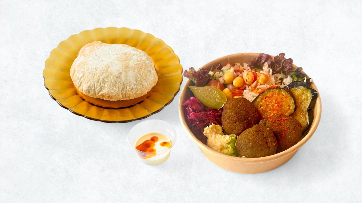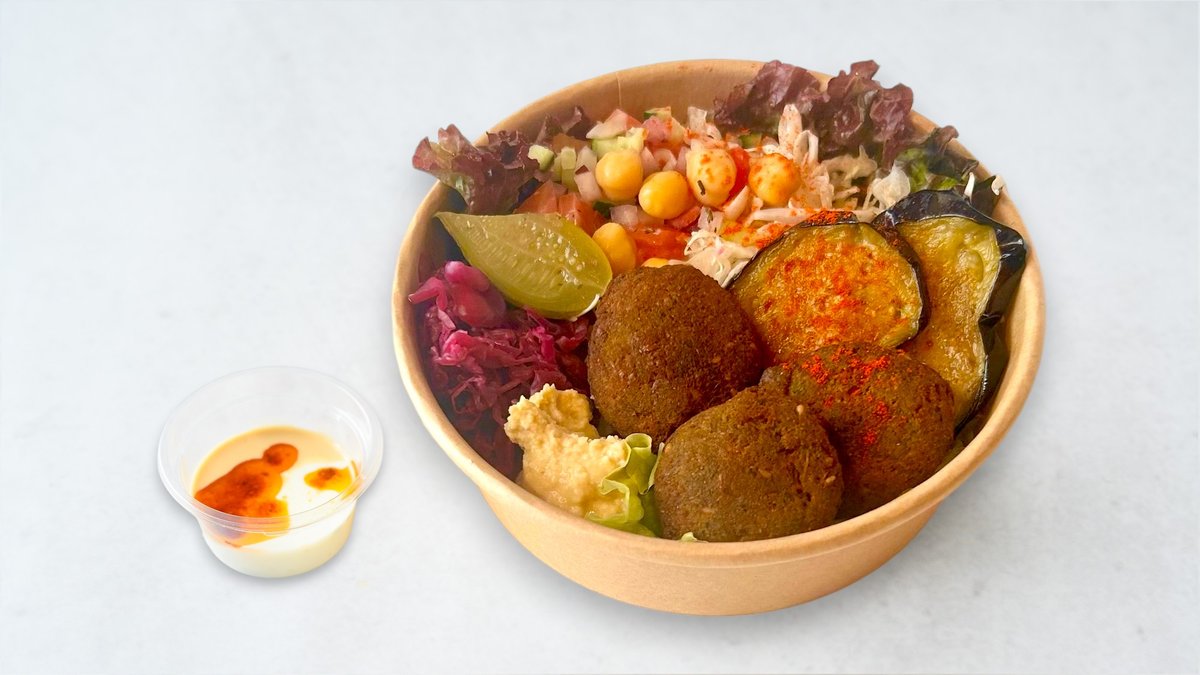 ファラフェルサンドの具材をサラダボウルにしました。揚げたてのひよこ豆コロッケとたっぷり野菜。 (一部に小麦、乳成分、ごま、りんごを含む)