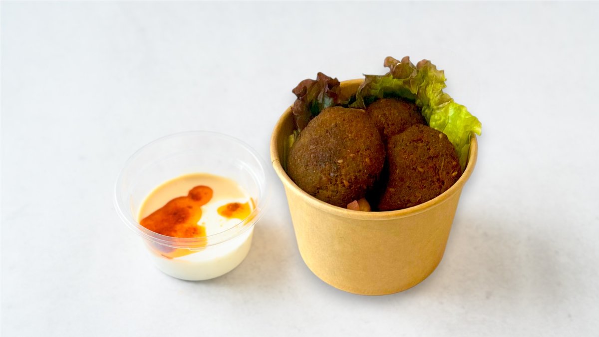 ファラフェルとはひよこ豆をスパイスやハーブと一緒にすり潰したコロッケのこと。 揚げたてコロッケにミニサラダ、ソース付きです。 (一部に小麦、乳成分、ごま、りんごを含む)
