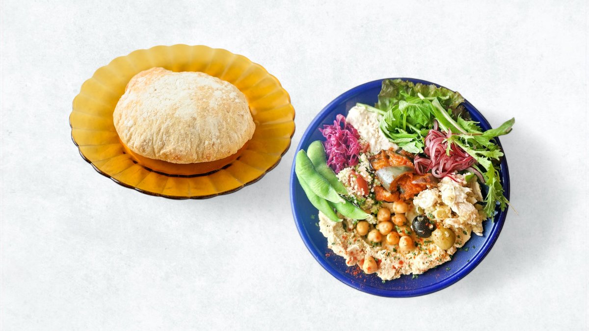 人気のフムス(ひよこ豆ペースト)をメインに地中海沿岸の国々の冷菜を盛り合わせた夏にピッタリな盛り合わせプレート。 ピタパンと一緒に一人贅沢なひと皿。また、前菜として少しずつ二人で。 ピリ辛茄子のトマト煮、ツナクリームチーズ、タブレ(クスクスサラダ)、紫玉ねぎマリネ、チキンキヌアサラダ、枝豆、グリーンサラダなど(一部変更する場合あり) (一部に小麦、乳成分、大豆、鶏肉、ごま、りんごを含む)