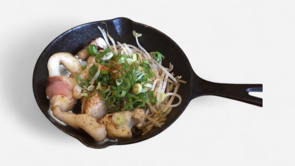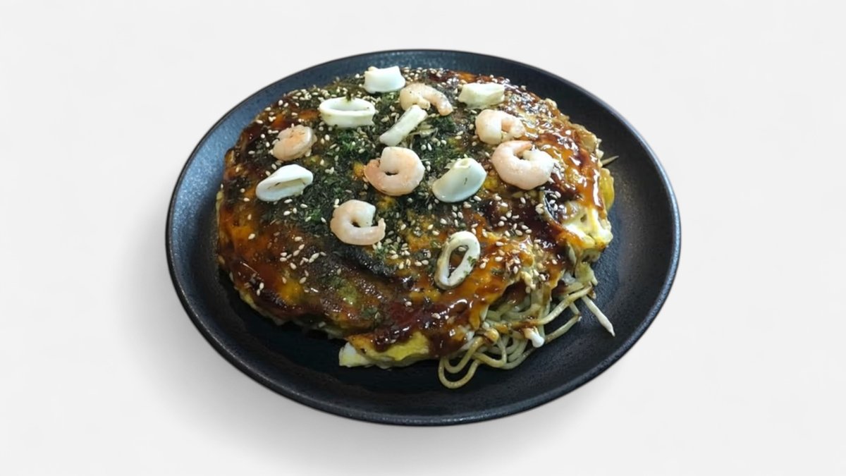 ぷりぷりの生エビと、旨みたっぷりの生イカ入り。 海の恵みを存分に味わえる、贅沢な一枚です。