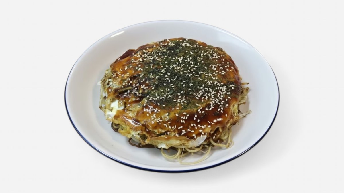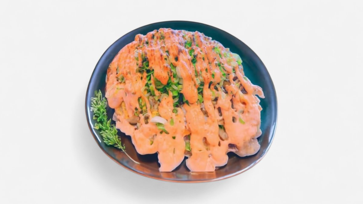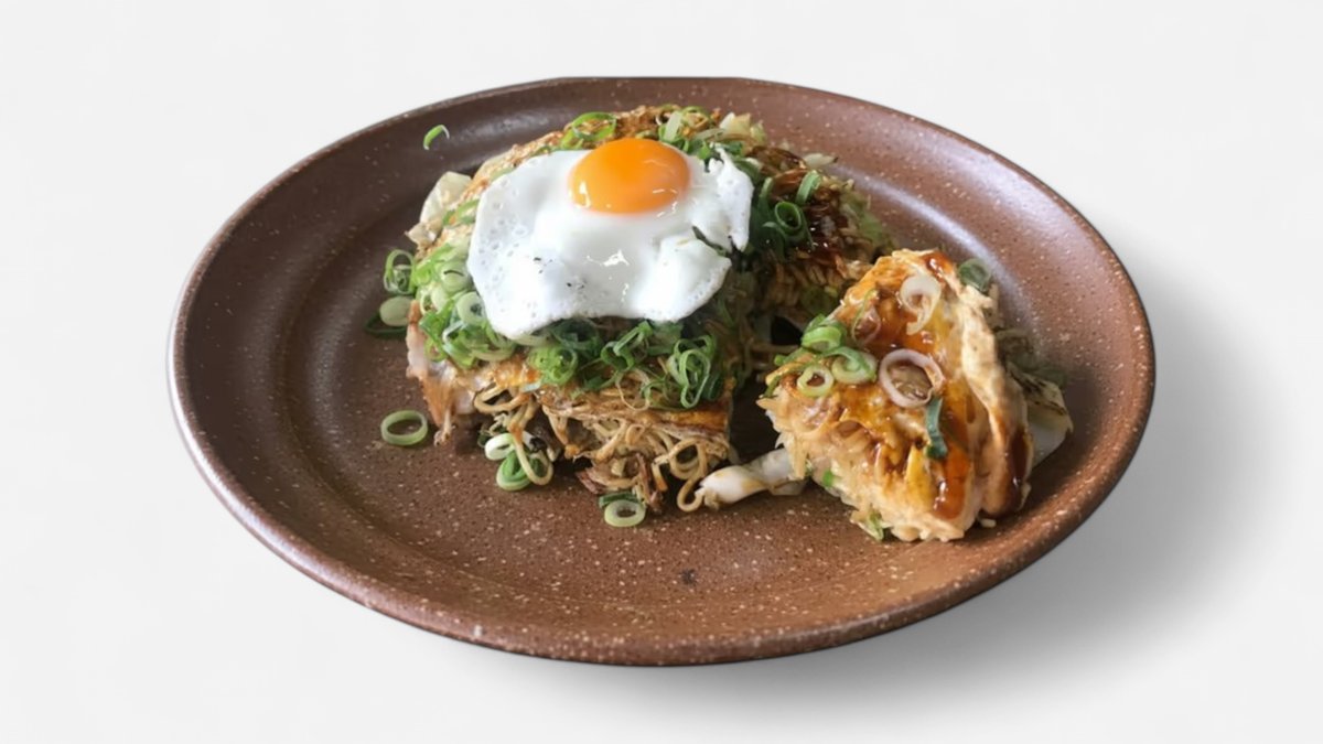 おろしニンニクガーリックチップ特製ネギタレのお好み焼きです😊食べごたえ抜群で、元気をチャージしたい時にぴったりの一枚です。