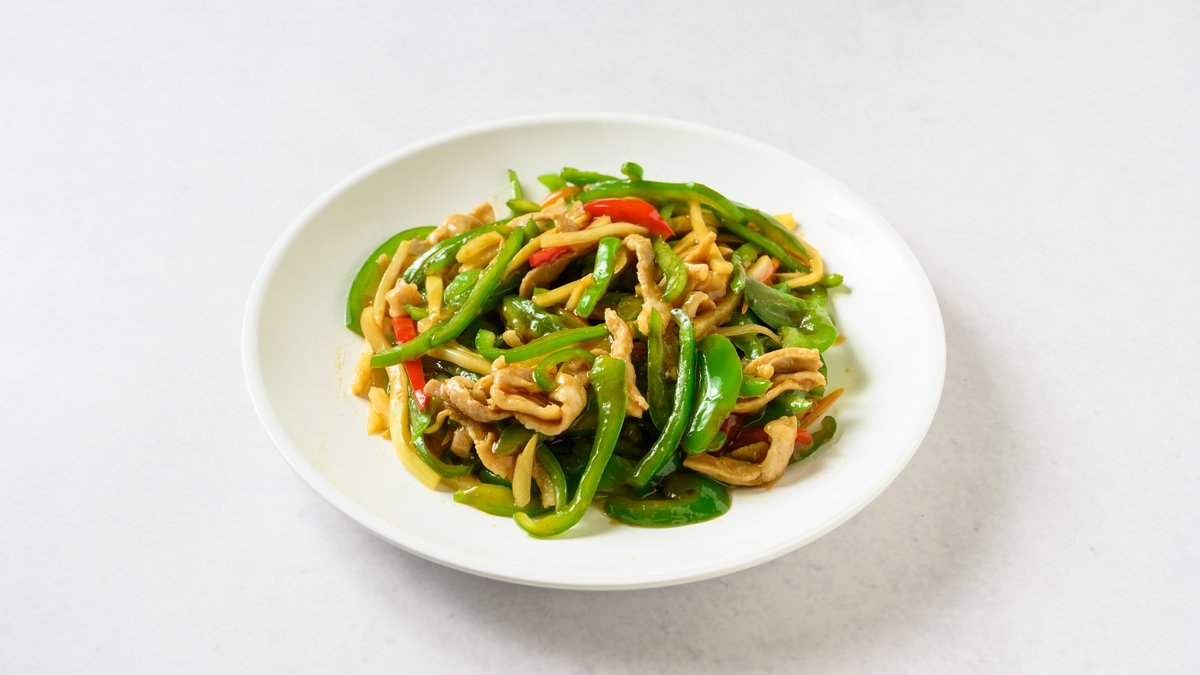 細切り肉とシャキシャキのピーマンを炒めた、ご飯にも麺にも合う中華料理です。