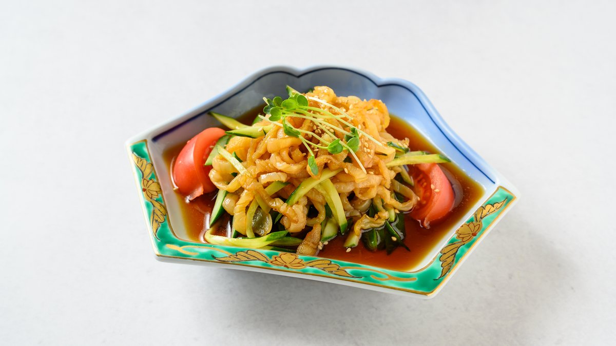 クラゲを細切りにし、特製の甘酸っぱい酢の物にした冷菜です。コリコリとした食感とさっぱりとした味わいが特徴です。