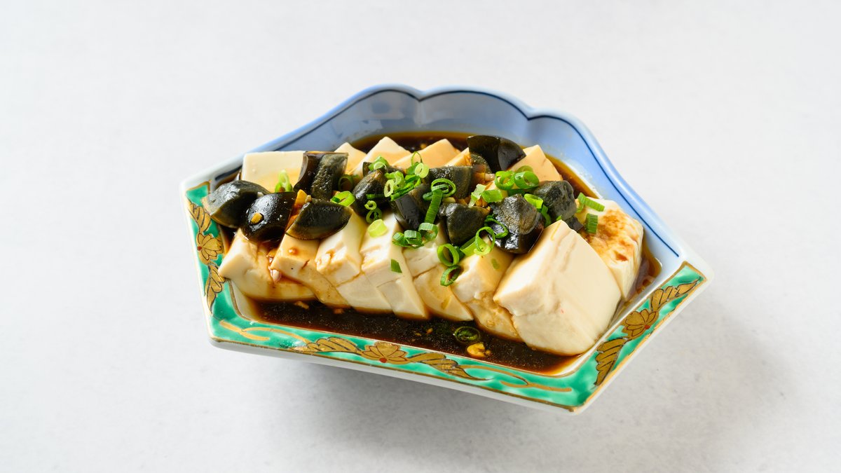 独特の風味を持つピータンと、冷たい豆腐を合わせた冷菜です。ピータンの濃厚な旨味と豆腐のさっぱり感が楽しめます。