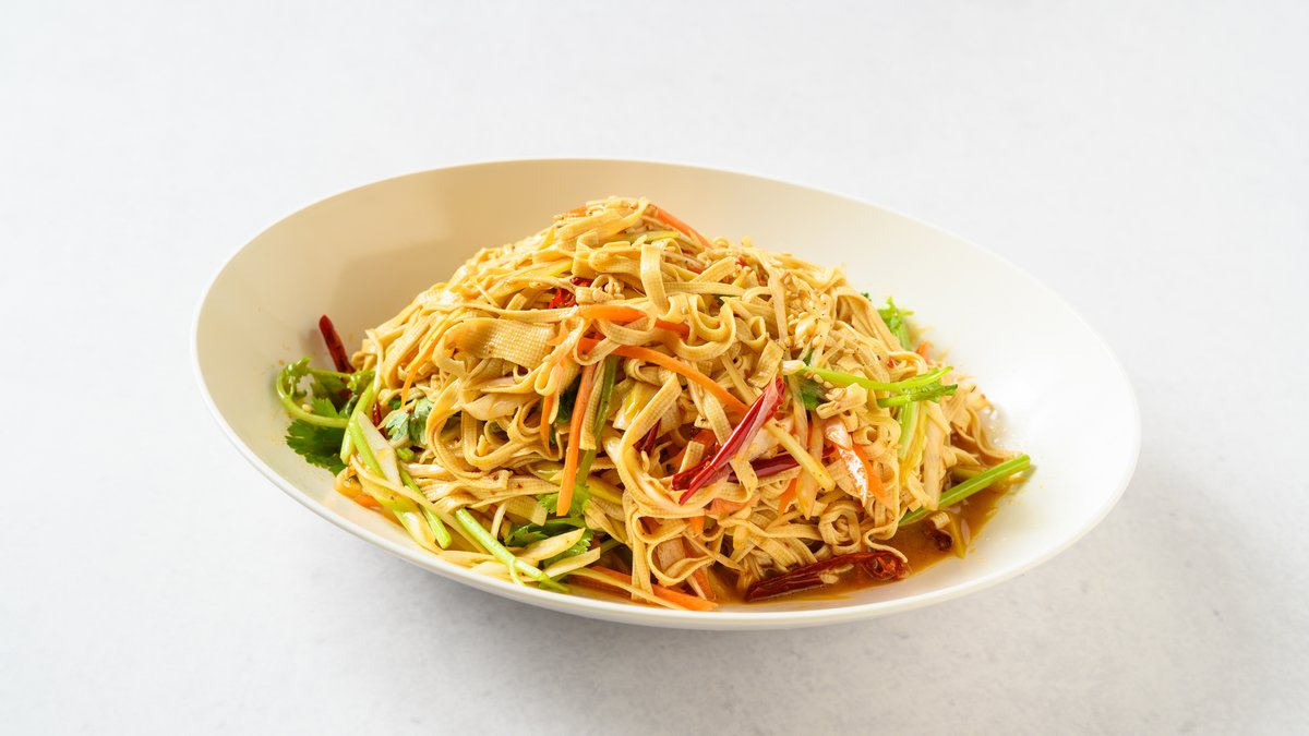 薄切りにした干し豆腐を、野菜や調味料と和えた中華風の冷菜です。ヘルシーながらも、さっぱりとした味わいと食感が楽しめます。