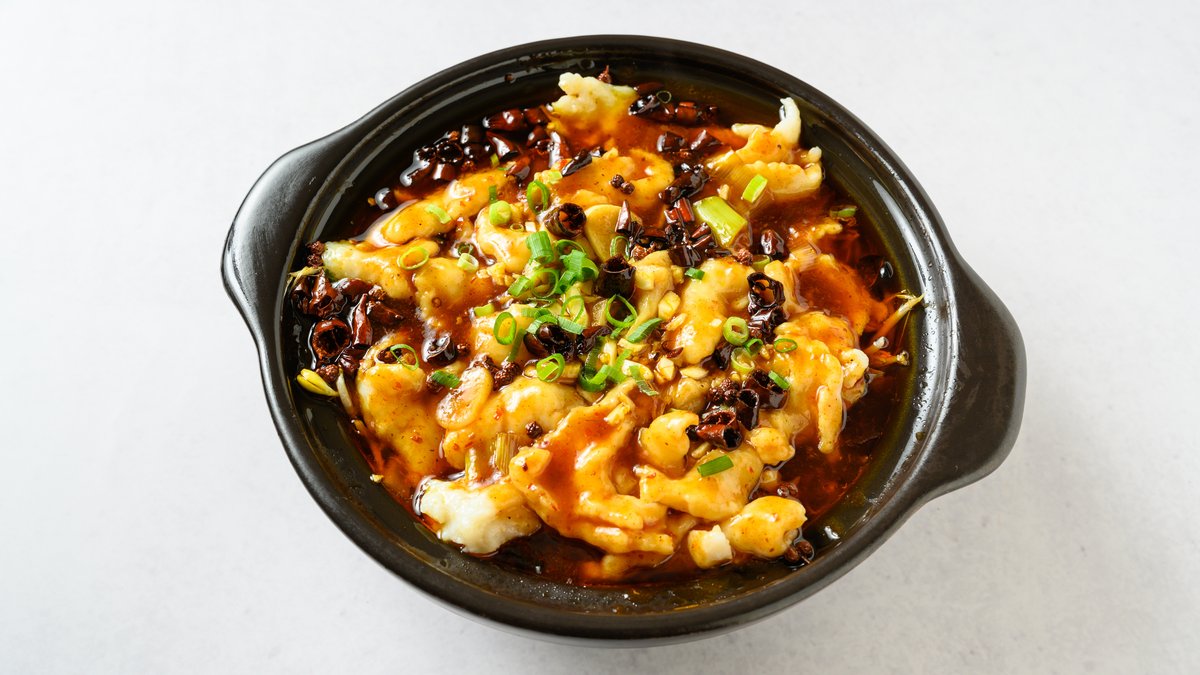 白身魚を四川風の辛い調味料で煮込んだ料理です。魚の淡白な旨味と、唐辛子や花椒の刺激的な辛さが特徴です。