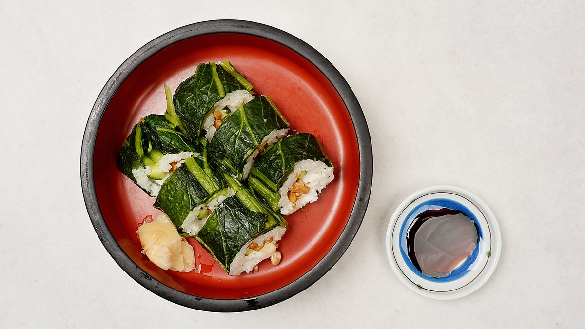長芋、きゅうり、納豆を広島菜で巻いたさっぱりとした巻き寿司です。