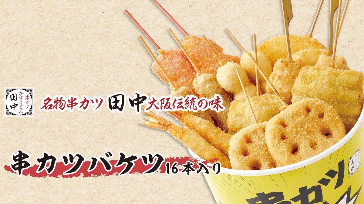 定番の串カツバケツ16本と、チューリップから揚げ5個・ポテトフライのこの時期限定のセット(串は、牛、豚、玉ネギ、レンコン、エビ、うずら、紅しょうが、アスパラ 各2本ずつ)※画像はイメージです。