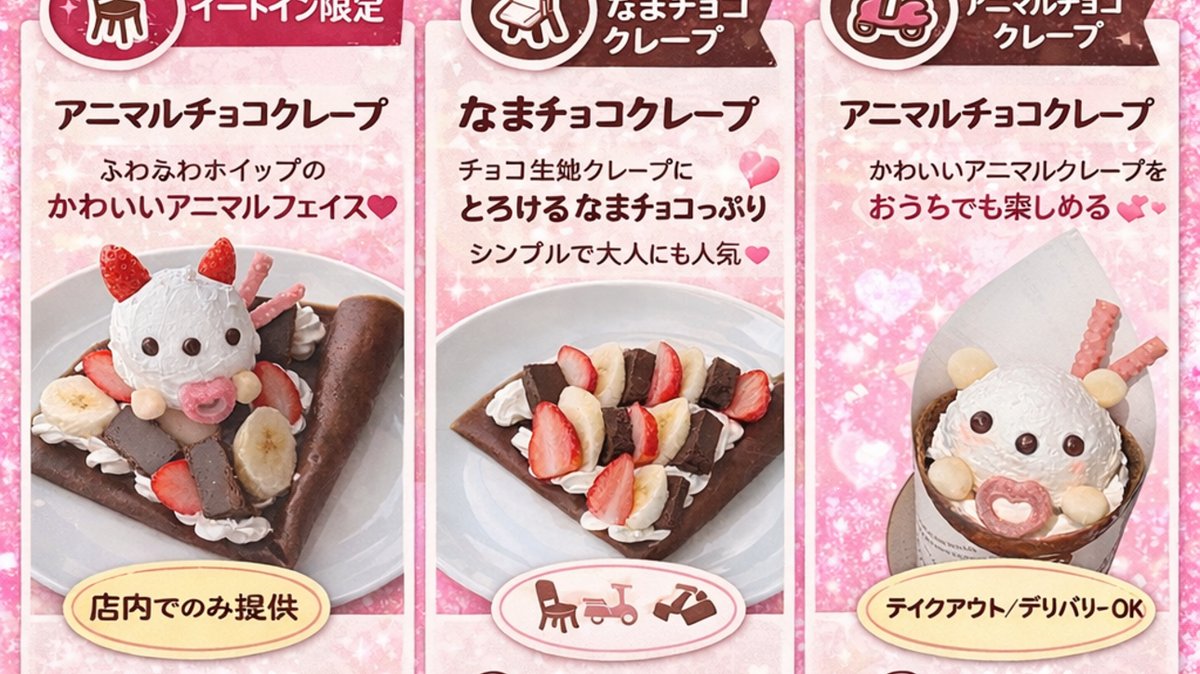 商品説明ですこちらでは購入できません。 左|イバレンタインのおやつや自分へのご褒美にもぴったり ートイン限定 も〜っとかわいい♡アニマルチョコクレープふわふわホイップで作ったキュートなアニマルフェイスチョコ生地クレープに中はお選びください。見た目も可愛く、写真映え間違いなし✨店内でゆっくり楽しみたい方におすすめです。 真ん中|定番バレンタイン なまチョコケーキたっぷり チョコ生地クレープ チョコ生地クレープになまチョコケーキ+ホイップクリーム。甘すぎず、チョコ好きさんに大人気❤️シンプルだからこそ、チョコの美味しさをしっかり楽しめる一品です。 右|テイクアウト・デリバリーOK おうちで楽しむ♡アニマルチョコクレープかわいいアニマルクレープをテイクアウト&デリバリー対応✨