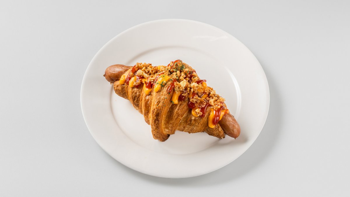 スパイシーなカレー風味のソーセージをサクサクのクロワッサンで挟んだ、食欲をそそるクロワッサンドッグです。