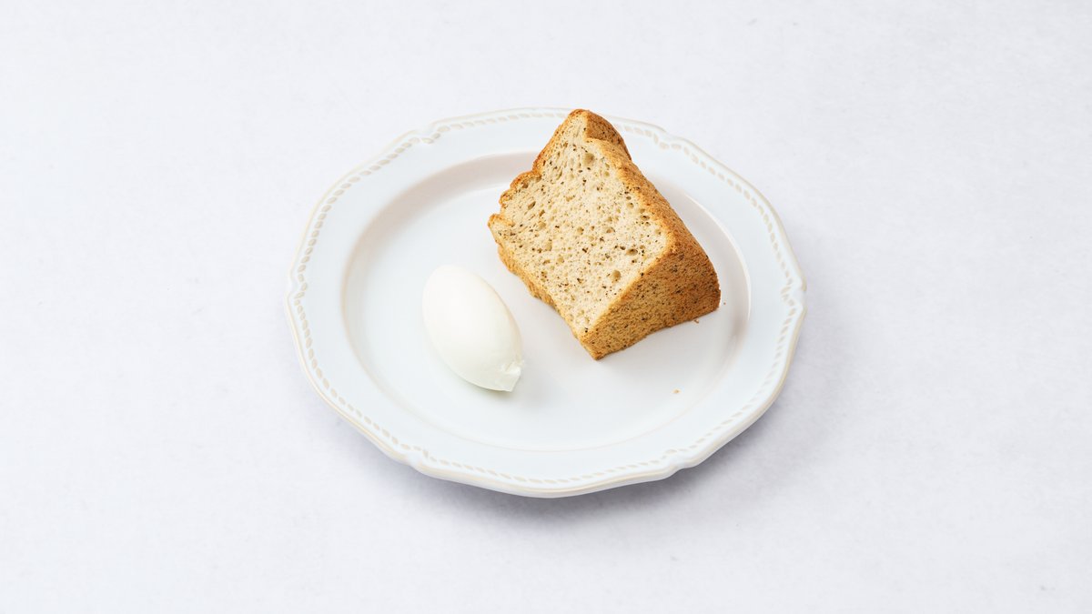 1972年にロサンゼルスの保険外交員で料理愛好家、ハリー・ベーカーさんによって、卵白のみを用いて作るエンジエルフードケーキを元に考案された。食感が絹織物のシフォンのように軽いことから名付けられたデザートです。 当店ではアールグレイを使うことにより香り高く、ふわふわでしっとりしたシフォン生地が特徴です。