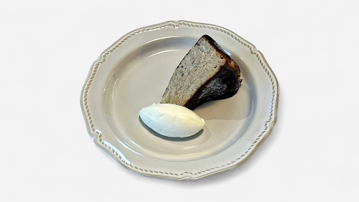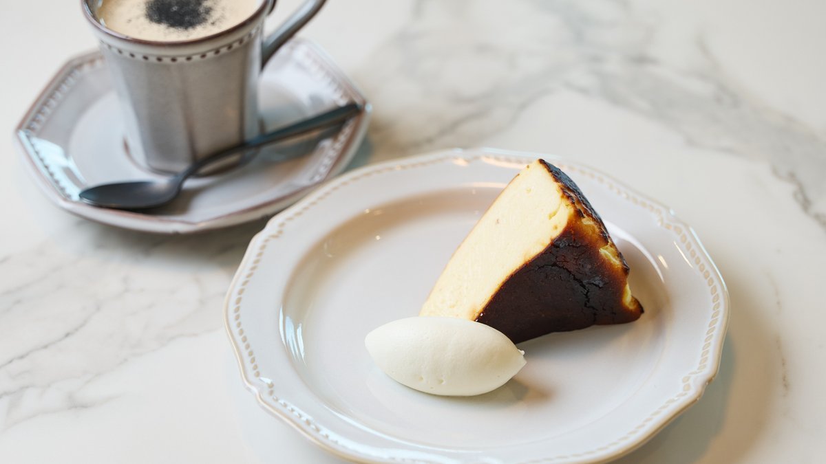 外側を黒く焦がした濃厚な風味のあるベイクドチーズケーキです。日本では2018年頃からバスクチーズケーキという名称で知られるようになりました。 店では、温度を高く設定したオーブンに入れて一気に焼くことで外側を黒く焦がし、ビターな大人の味わいに仕上げました。