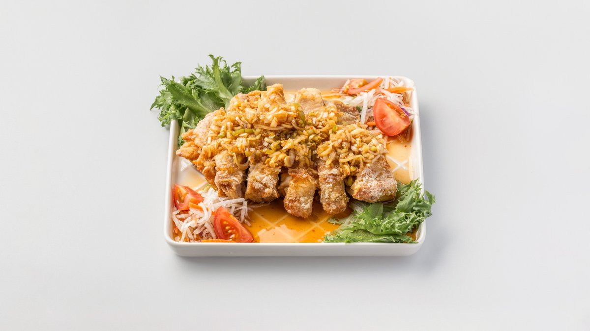 揚げた鶏肉に、ネギと生姜の風味を効かせた甘酸っぱい特製ソースをかけた、食欲をそそる一品です。