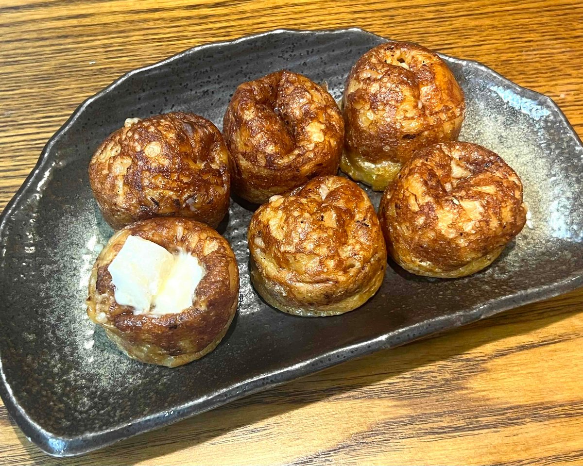 みんな大好き明太チーズをのせた贅沢な一品です。中におもちが入っています。