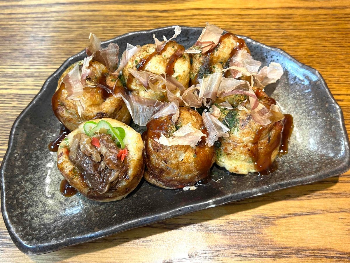 タコの代わりに当店手作りの牛すじ煮込みが入っています。ネギも入って相性バツグン。