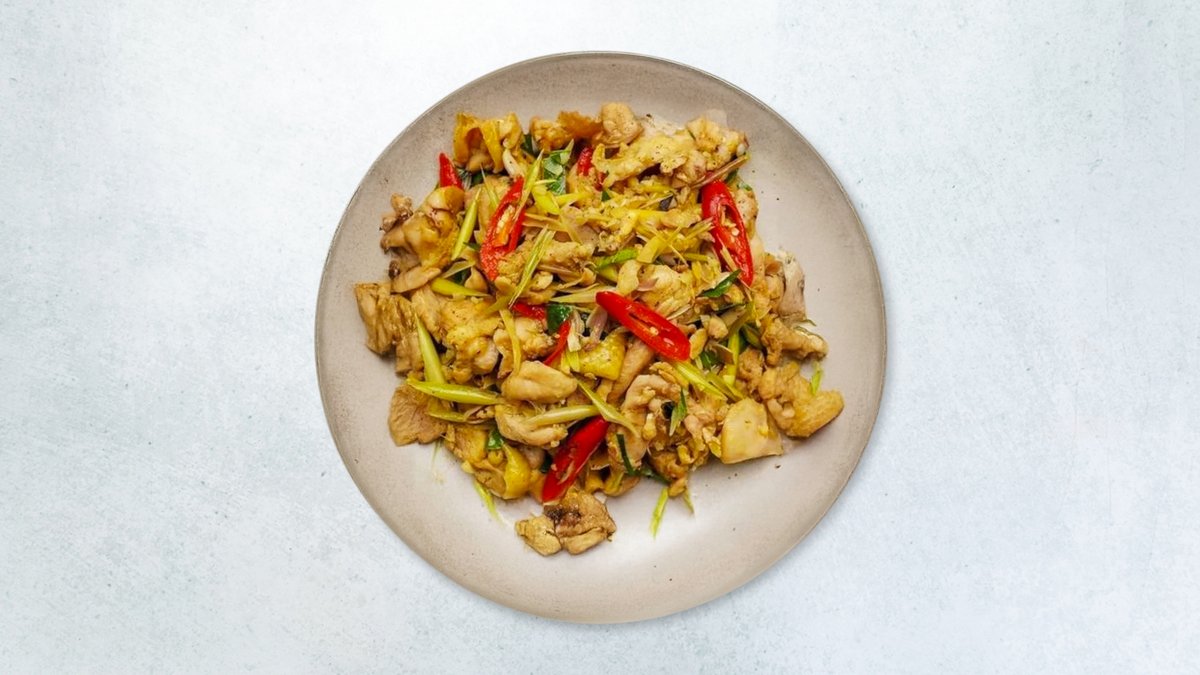 レモンの酸味が絡み合う、美味しい鶏とレモングラス炒めです。
