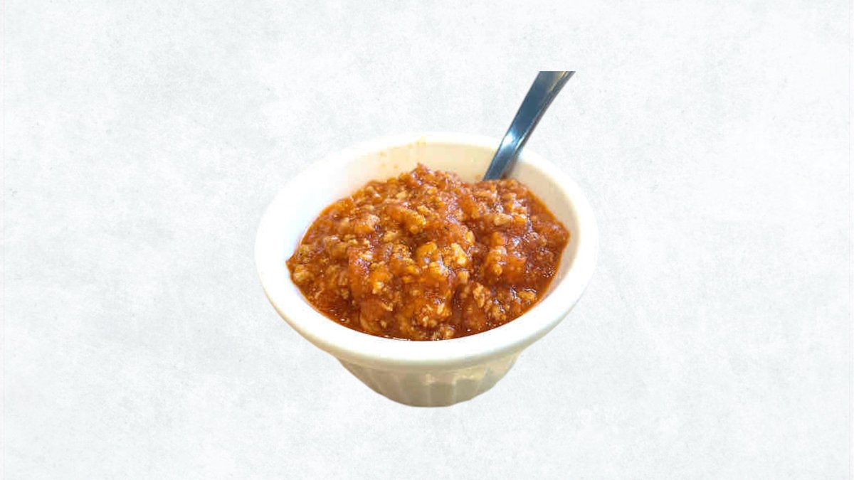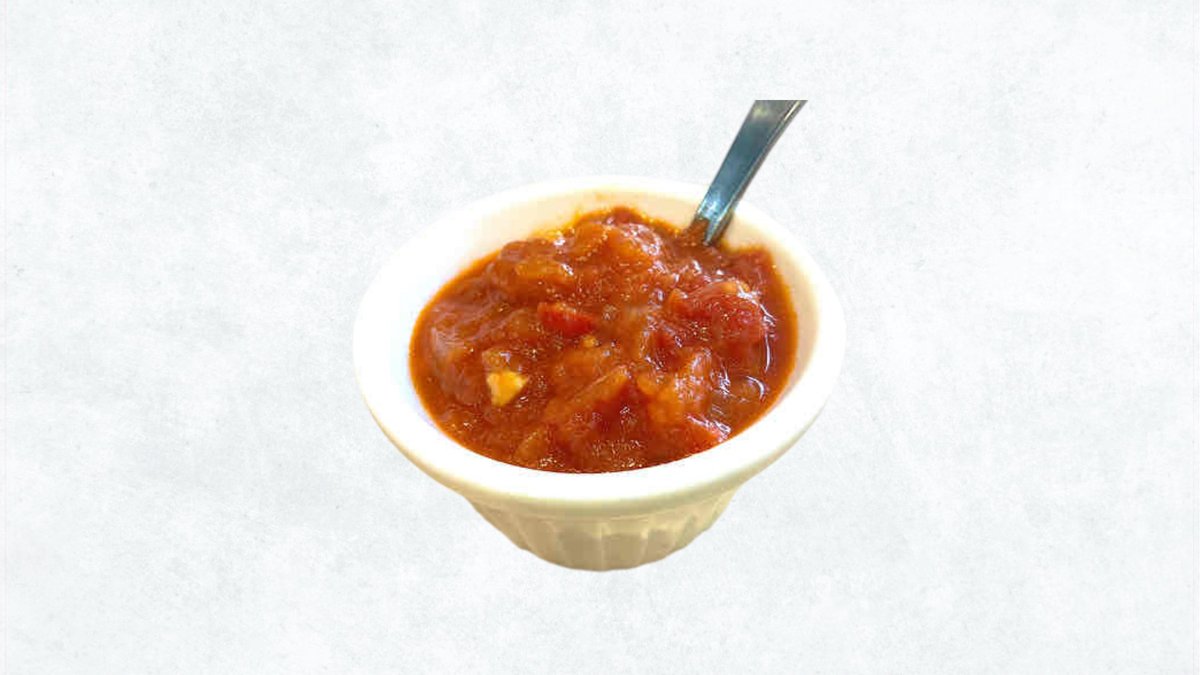 大好評の自家製ピリ辛トマトのサルサソース。ローストチキンや、ターメリックライスに最高によく合います。 / Our highly popular homemade spicy tomato salsa sauce. It pairs perfectly with roast chicken and turmeric rice.