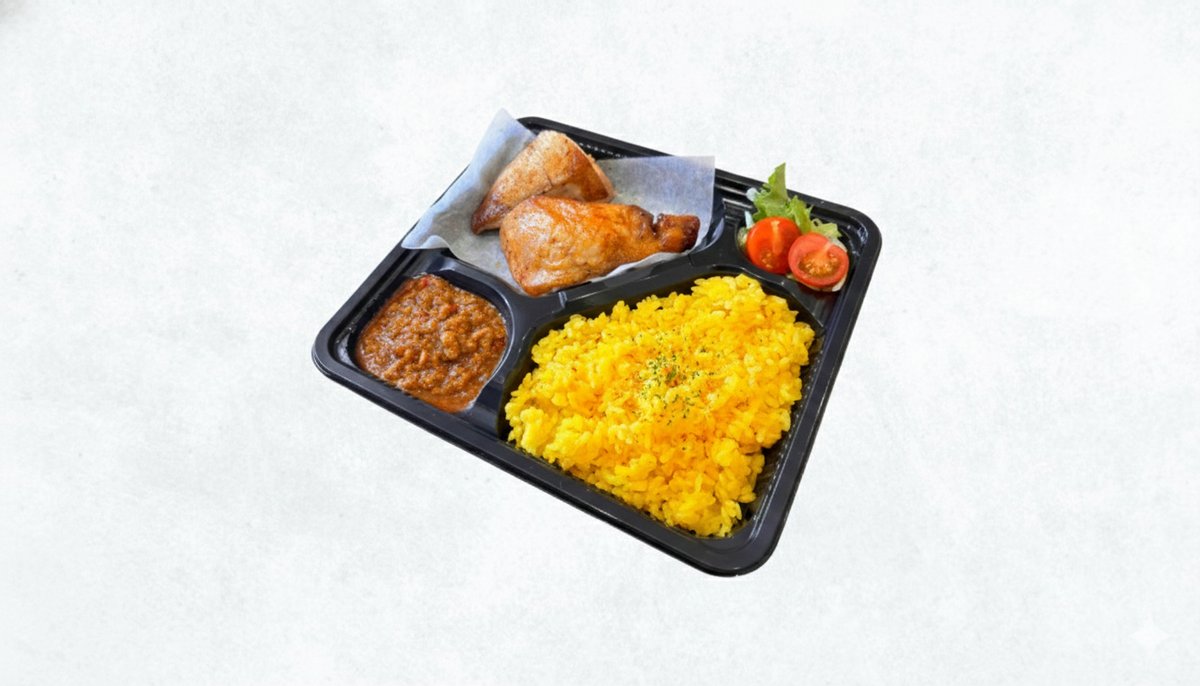 超お得なランチ限定弁当です。(ローストチキン2ピース、ターメリックライス、キーマカレーソース、一口サラダ)お昼もやっぱりヘルシーなのにジューシーなローストチキン! 2 pieces of roast chicken, turmeric rice, keema sauce, one bite salad.