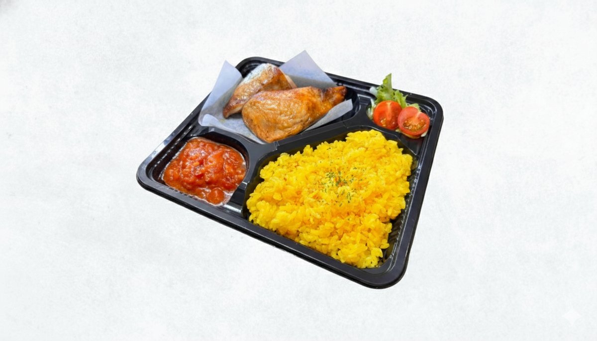 超お得なランチ限定弁当です。(ローストチキン2ピース、ターメリックライス、サルサソース、一口サラダ)お昼もやっぱりヘルシーなのにジューシーなローストチキン! 2 pieces of roast chicken, turmeric rice, salsa sauce, one bite salad.